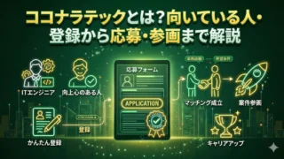 ココナラテックは、フリーランスITエンジニア専門のエージェントサービスです。常時15,000件以上・基本支払いサイト15日・12職種150スキル対応。仕組み・向いている人の条件・登録から初回応募完了までの手順をスクリーンショット付きで解説します。